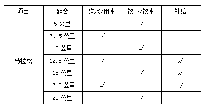 自起点开始每隔5公里设置一个饮料站,每两个饮料站中间设置饮水/用水站;每个饮料、饮水/用水站前50米处设提示牌。禁止任何未经许可的个人接触参赛者的饮水和饮料,同时也禁止选手接受任何非大会的固定供水点或其他选手递交的饮水和饮料。